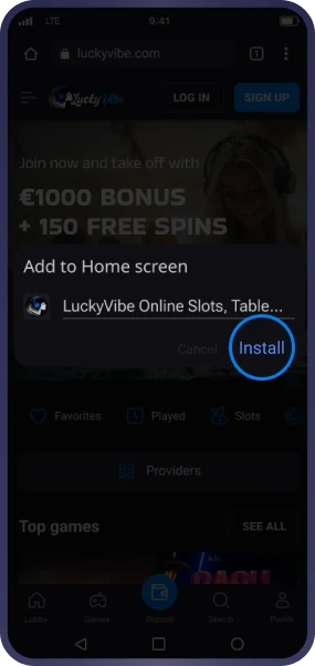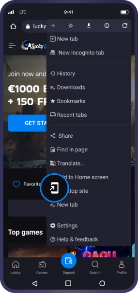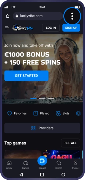 Allez sur la page d'accueil de Lucky Vibe et appuyez sur les trois points pour ouvrir le menu du navigateur.