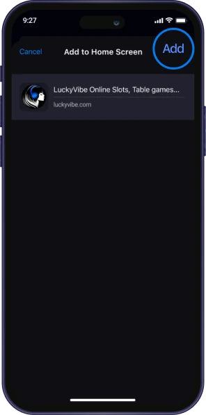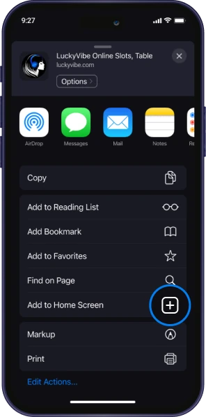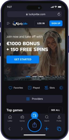 Ouvrez luckyvibe.com avec Safari, appuyez sur "Partager" dans le panneau de navigation inférieur.